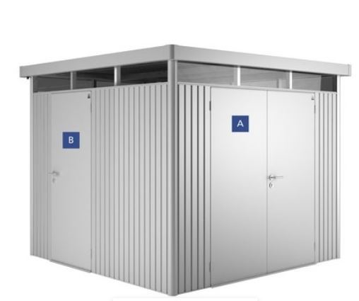 Afin de pouvoir accéder à votre abri par deux côtés vous pouvez installer une deuxième porte sur un côté latéral. Avec la porte supplémentaire sont livrés une poignée inox avec un cylindre standard à verrouillage triple, un ressort à gaz, des charnières, 2 supports de petits outils ainsi que les taquets de tôle. L'ouverture de porte est possible uniquement à droite.
