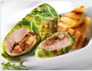 5. Mettez les râbles désossés à plat et garnissez le « creux » avec des morceaux de poires rôties. Ajoutez un peu de farce et assaisonnez en sel et poivre. Roulez le râble farci de façon à obtenir un boudin. Enroulez les boudins dans 1 ou 2 feuilles de chou en rabattant les bords à l’intérieur de façon à obtenir un pannequet. Ficelez les pannequets de façon à maintenir la feuille de chou pendant la cuisson. Assaisonnez en sel et poivre puis d’un filet d’huile d’olives.